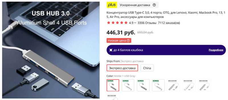 Очень компактный и удобный USB-хаб на 4 порта. Корпус выполнен из алюминия, есть версии подключения с USB-A или USB-C, также есть версии, где один из портов - Type-C. Есть быстрая доставка.