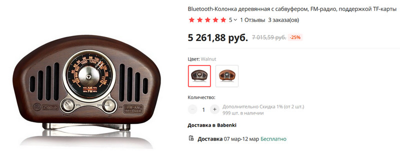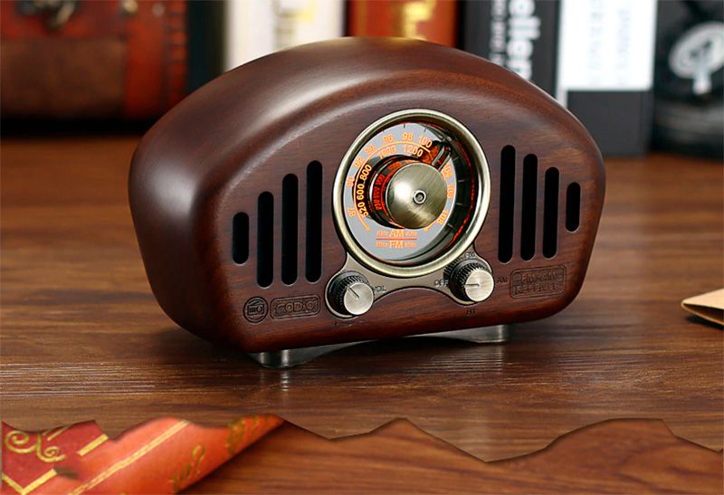 Для любителей ретростиля - беспроводная деревянная колонка, сделанная в дизайне старого радиоприемника. Встроенный аккумулятор на 3600 мА·ч, два динамика по 8 ватт каждый, сабвуфер, поддержка карты памяти (MP3), Bluetooth 5.1, FM-радио, есть возможность проводного подключения.