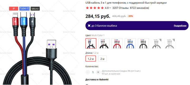 Для тех, кто не любит, когда три головки находятся на одной площадке, есть хороший вариант кабелей различных цветов (несветящиеся) с тремя раздельными головками (я такие и использую, очень удобно). Длина - 1,2 и 2 метра.