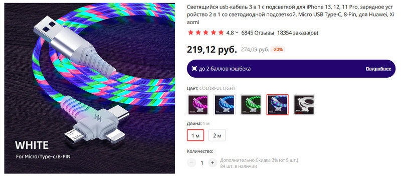 Универсальный зарядный кабель с тремя головками: lightning (под айфоны/айпэды), Type-C и microUSB. Есть светящиеся варианты различных цветов, есть несветящийся белый. Длина - 1 или 2 метра.