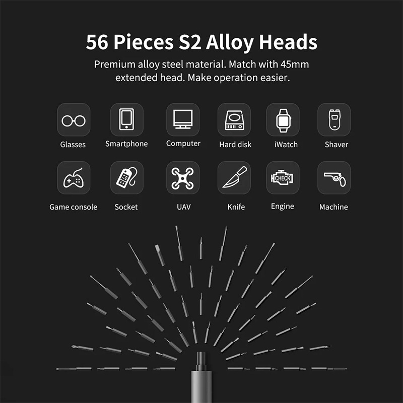 Очень компактная отвертка со светодиодной подсветкой для различных тонких работ. В комплект входит набор из 56 стальных бит, также там в комплекте кабель для зарядки, набор: магнитный коврик, подставка, баночка для шурупов, пластиковый медиатор, присоска, магнетизатор и футляр для переноски.