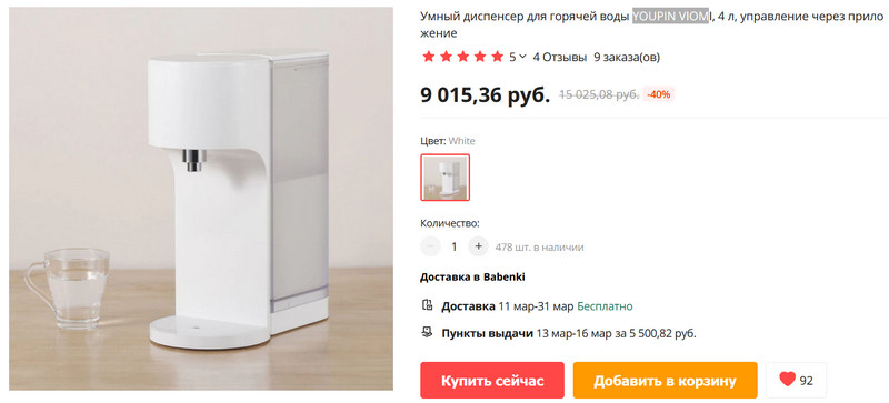 В обсуждении термопота несколько раз порекомендовали вот такой интересный диспенсер для горячей или холодной воды - YOUPIN VIOM. Это не термопот, в нем вода находится не нагретая, однако при нажатии кнопки вода очень быстро нагревается до нужной температуры (при этом сразу наливается в чашку) или, наоборот, охлаждается. Каким-то пользователям такое устройство подойдет лучше термопота.