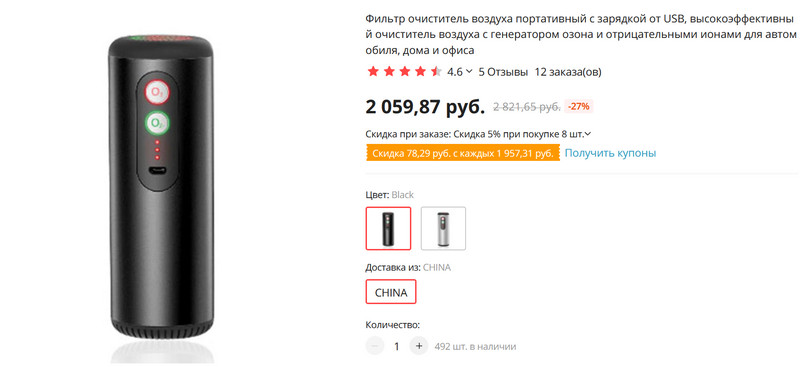 Портативный (4,6 см) очиститель воздуха для автомобиля, дома или офиса. Озоновая стерилизация и ионизация. Площадь - 10 кв. м. Питание от USB, встроенного аккумулятора хватает на 4 часа.
