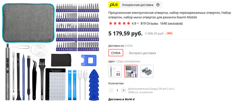 Прецизионная аккумуляторная отвертка для мелкого ремонта различной техники и гаджетов. Я именно такую и использую, она меня много раз выручала. Только у меня модель без подсветки и на круглых аккумуляторах, а здесь подсветка и аккумулятор встроенный. Есть вариант просто отвертки без бит, есть вариант с битами, есть полный комплект: 48 бит, магнитный коврик, пинцет, пластиковые медиаторы и лопатки для аккуратного вскрытия корпусов гаджетов, присоска, намагничиватель и скрепка для извлечения сим-карты, кабель для зарядки и футляр для хранения. Также есть экспресс-доставка одного варианта комплектации.