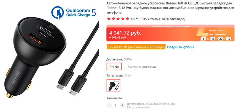Очень продвинутый автомобильный адаптер с тремя портами (один USB-A и два Type-C) с поддержкой QC 5 и суммарной мощностью аж до 160 ватт (100+30+30). Может одновременно заряжать сразу три устройства. Также позволяет заряжать ноутбуки с питанием через Type-C (производитель обещает полную зарядку ноутбука MateBook X Pro за 153 минуты).