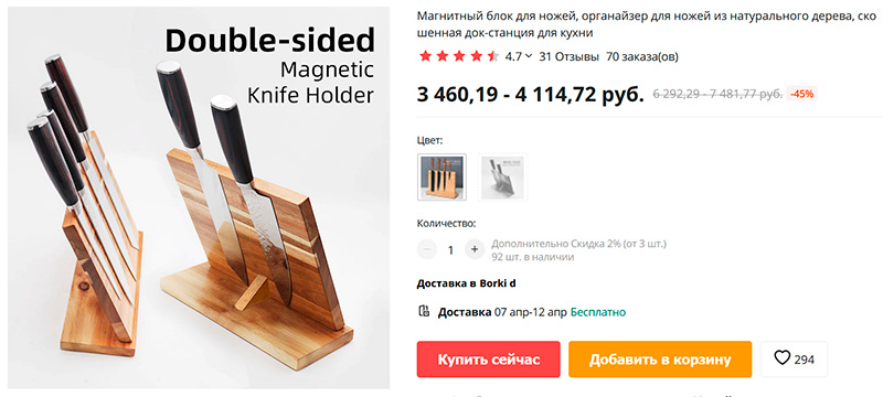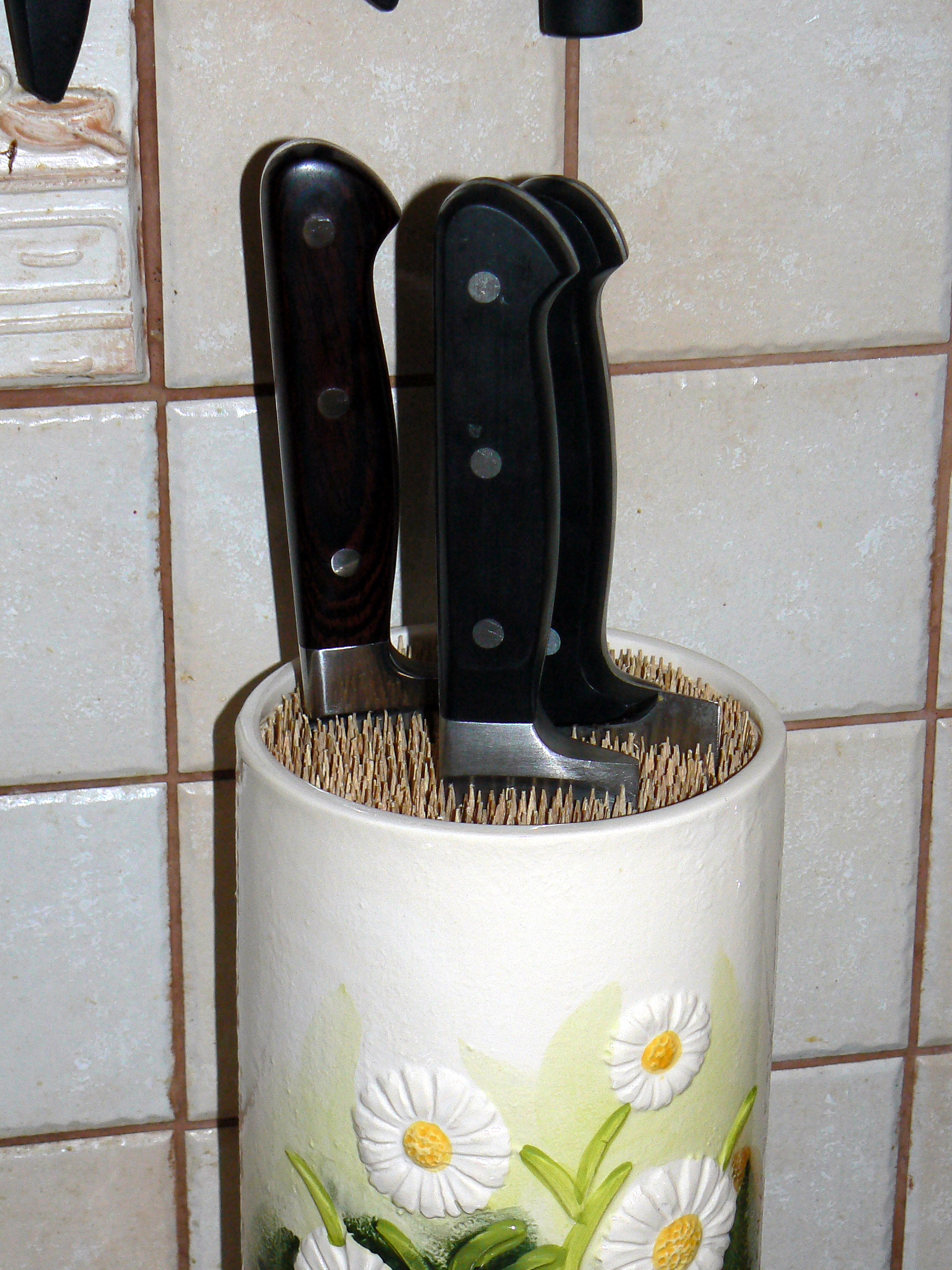 Вертикальный деревянный двухсторонний магнитный органайзер для ножей. Таким значительно удобнее пользоваться, чем деревянным с прорезями. Заказал себе.