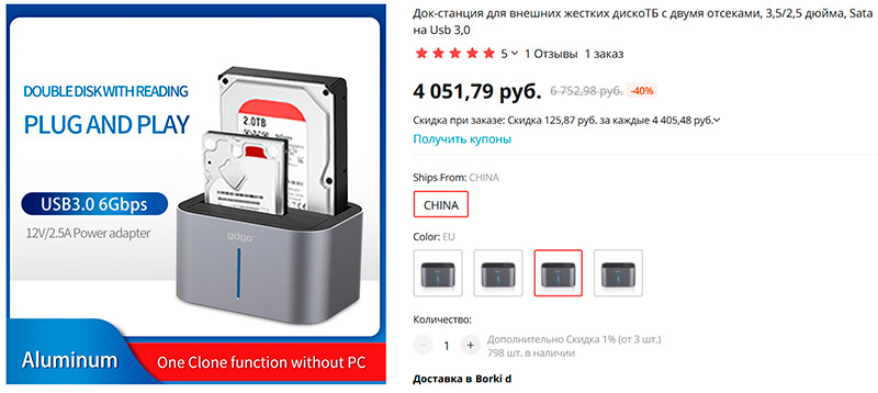 Внешняя док-станция на два диска для подключения по USB 3.0. Материал - алюминий. Может одной кнопкой скопировать информацию с одного диска на другой без подключения к компьютеру. Для бэкапов, для хранения всяких медиаданных. (Я такие док-станции использую с медиаплеером и с компьютером для бэкапов.)