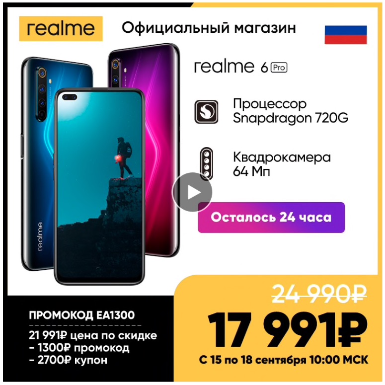 Смартфон Realme 6 Pro 128GB за 18 тысяч рублей с учетом купона (берется на странице с телефоном) и промокода EA1300. Акция с 15 по 18 сентября в официальном магазине Realme с быстрой доставкой из России. Вроде норм аппарат