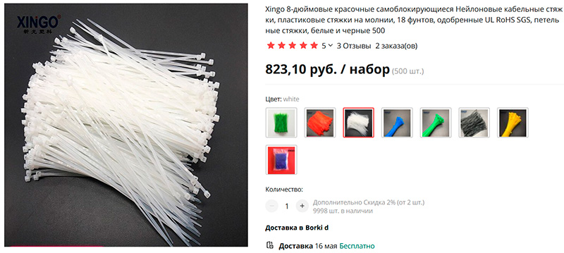 Нейлоновые самоблокирующиеся стяжки - отличное средство для организации любых проводов. Здесь большие наборы, которых хватит надолго. У меня куплены такие черные и белые, использую их постоянно. Также тут доступны и другие цвета.