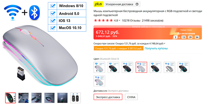 Беспроводная компактная аккумуляторная мышка под различные операционные системы с возможностью подключения как через специальный адаптер, так и по Bluetooth, чтобы не занимать порт адаптером (внимание - варианты дешевле без поддержки подключения по Bluetooth). Черные, белые, серые, со светящимся логотипом и без него. Есть быстрая доставка с российского склада.