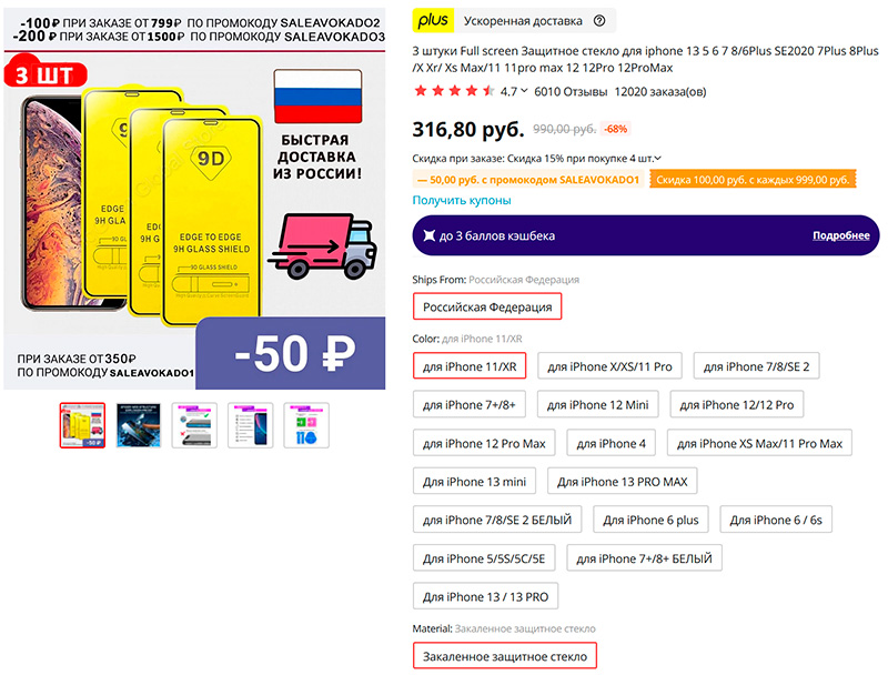 Защитные стекла почти для всех видов айфонов. В комплекте - 3 стекла. Доставка с российского склада.
