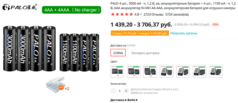 Недорогие перезаряжаемые никель-металлогидридные аккумуляторы AA и AAA по четыре каждого типа, по восемь, по двенадцать, с зарядным устройством или без него. AA - 3000 мА·ч, AAA - 1100 мА·ч.