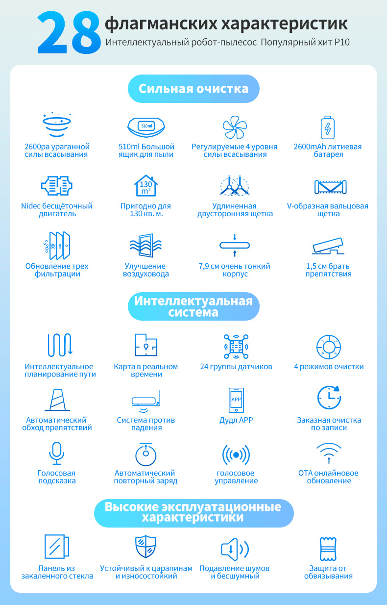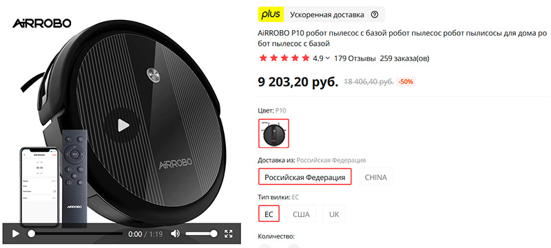 Недорогой робот-пылесос AiRROBO P10. Мощность всасывания 2600 Па, есть база для зарядки, управляется со смартфона, умеет строить карту помещения, достаточно тонкий, низкий уровень шума. Доставка с российского склада.