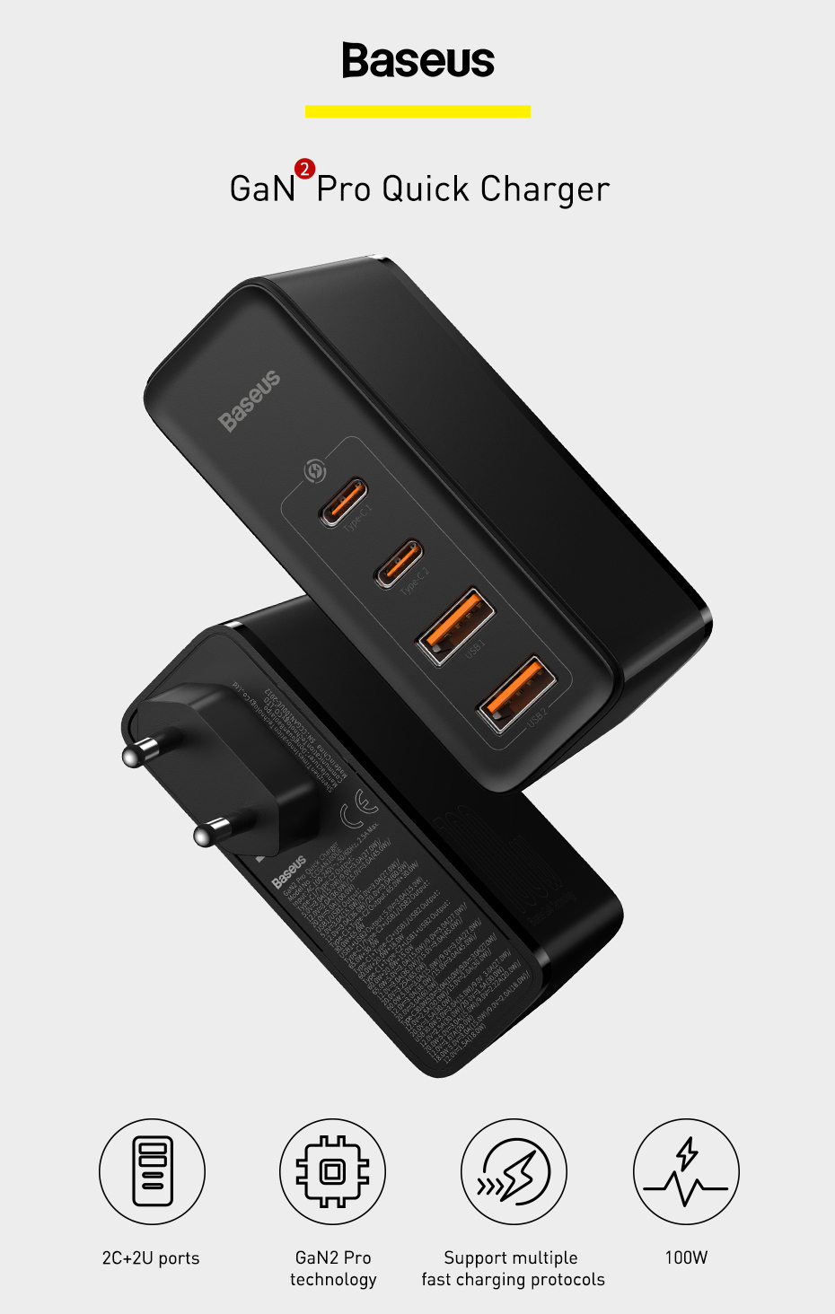 100W GaN зарядное устройство с 4 портами USB для быстрой зарядки.