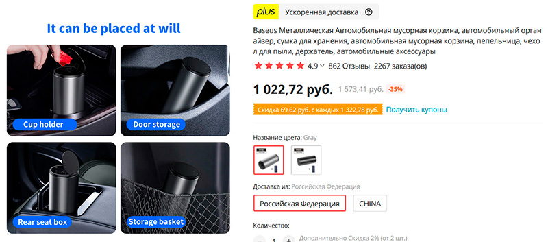 Ещё для машины - герметично закрывающаяся компактная урна на 500 мл из алюминиевого сплава для машины (и не только для машины). Крышка открывается при нажатии. Может вставляться в подстаканник, подлокотник, в автомобильную дверь и так далее. Есть доставка с российского склада.