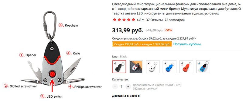Удобный брелок-мультитул: нож, открывалка, плоская и крестовая отвёртки, фонарик. Заказал себе, у меня есть брелок с ножом, который неоднократно выручал, а это более функциональный вариант.