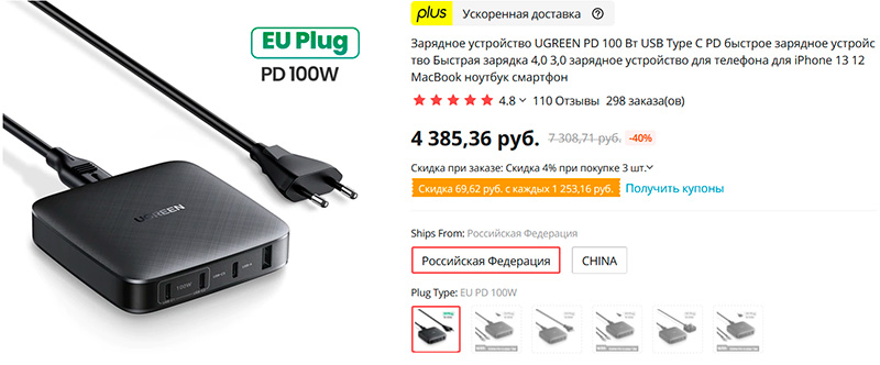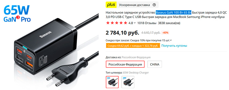 Аналогичный вариант, но на 65 ватт и почти в два раза дешевле - Baseus GaN 65 ватт. Тоже 4 порта, тоже питается от розетки длинным кабелем, также поддерживает стандарты PD, QC 4.0 и ниже, также нормально питает и заряжает ноутбуки. Есть там версия и на 100 ватт, но дороже на тысячу.