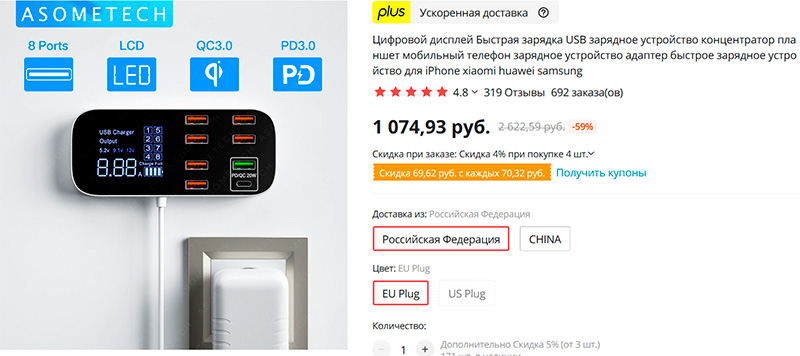 Совсем недорогой, но удобный и информативный адаптер Asometech ASA9DP аж на 8 портов. Также питается от розетки от длинного кабеля, может ставиться на стол или крепиться к стене. Поддерживает PD и QC 3.0, два порта с быстрой зарядкой на 18 и 20 ватт, остальные порты по 10 ватт. Есть дисплей, который показывает параметры зарядки на различных портах. Есть доставка с российского склада.