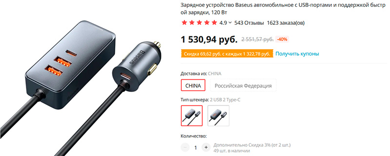 Ну и для тех, кому в машине не хватает портов - автомобильный адаптер от Baseus для прикуривателя. Четыре порта для зарядки, длинный кабель для адаптера (чтобы можно было подключиться с задних сидений), общая мощность 120 ватт, поддержка стандартов быстрой зарядки. Есть доставка с российского склада.