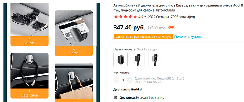 И еще для автомобиля - два типа держателя от Baseus. Один держатель - крючок для солнцезащитного козырька, куда можно вставлять солнечные очки или еще что-то (например, пластиковую карту), второй тип - крючок на липучке для чего угодно: сумочек, проводов и так далее.