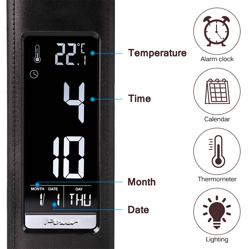 Люблю такое. Многофункциональная настольная лампа с дисплеем, на котором отображаются температура, время, дата и день недели. Также есть встроенный будильник. Наклон лампы гибко регулируется, есть три уровня яркости свечения.