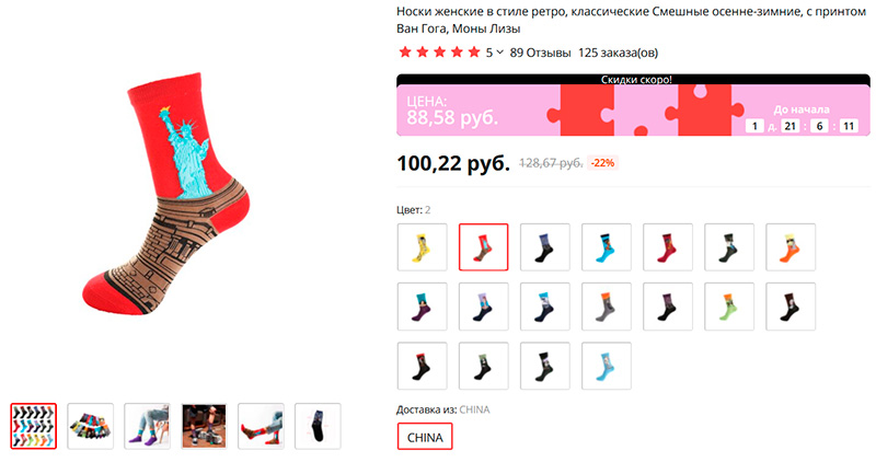 Для любителей носков с прикольными принтами. От забавных рисунков и расцветок до шедевров мировой живописи. Эластичные, подходят для размеров от 35 до 42. Материал - хлопок и спандекс.