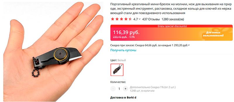 Миниатюрный нож из нержавеющей стали в виде брелока (и брелка тоже). Открывать посылки, строгать палочку, делать прорезь в пакете - да мало ли что! Масса применений! Плюс - брелок, причем полезный, а не бесполезный.