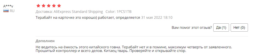 Терабайт за 12$ — это, как правильно выше написали, мягко говоря, подозрительно. Открываем отзывы: «Заказал карту micro SD ТБ (1000 ГБ). После получения я протестировал её с помощью h2testw_1.4, которая показывает, что 42,5 Гб в порядке, а остальных 957,5 ГБ либо вообще нет, либо они дефектные».