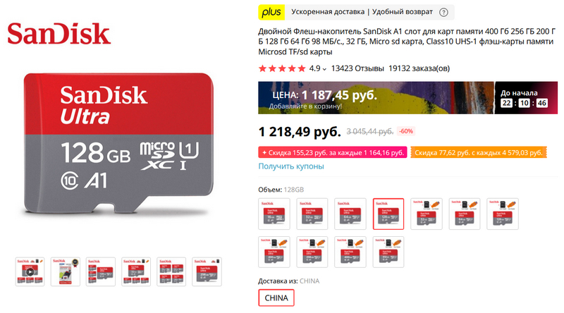 Сейчас идентичная microSDXC UHS-I SANDISK Ultra 80 64 ГБ в ситилинке на 6 рублей дешевле. С гарантией и доставкой завтра-послезавтра. Вот 128 на 87 рублей дешевле, но оно того никак не стоит.