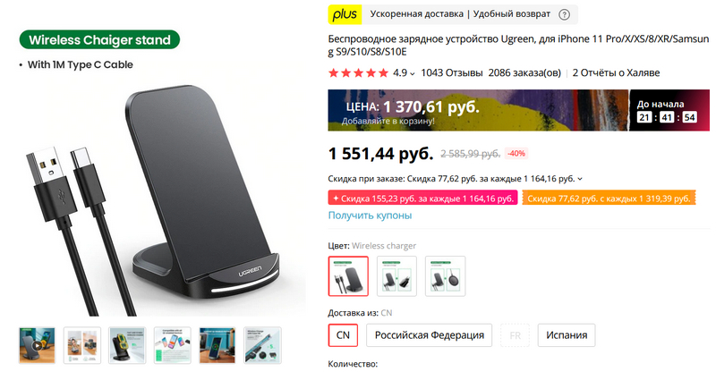 Подставка и одновременно беспроводная зарядка от Ugreen. Если смартфон поддерживает быструю зарядку до 10 ватт, то можно взять второй комплект с соответствующим адаптером. Если адаптер есть, тогда на второй комплект можно деньги не тратить.