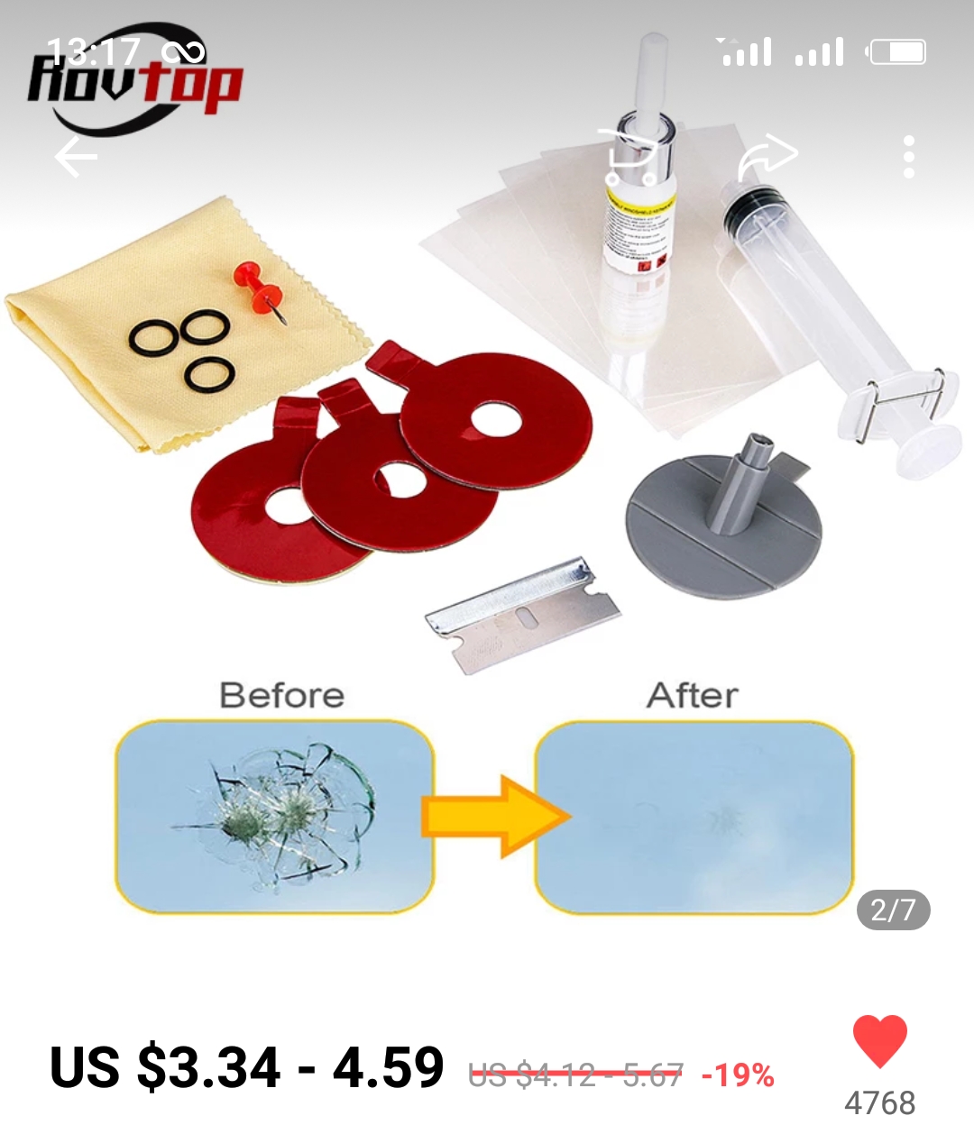 Ремкомплект для "паутинок" и прочих сколов на лобовом стекле авто. Фоткам китайцев не верю, но 4,6 рейтинг при 2000+ заказов и фото "до" и "после" в комментариях говорят о том, что вещь работает.