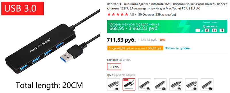 Разнообразные USB-хабы: от обычных на 4 порта USB 3.0 до хабов на 10 и 16 портов, причем с отдельным выключателем для каждого порта.