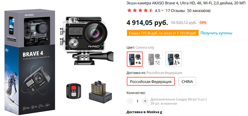 Дешевая экшен-камера для начинающих - AKASO Brave 4. Разрешение 4K 30 fps, FHD 60 fps, есть электронная стабилизация и аквабокс. Время работы при записи 4К - 60 минут. В комплект входят два аккумулятора, пульт ДУ, несколько видов креплений. Есть поставка с российского склада.