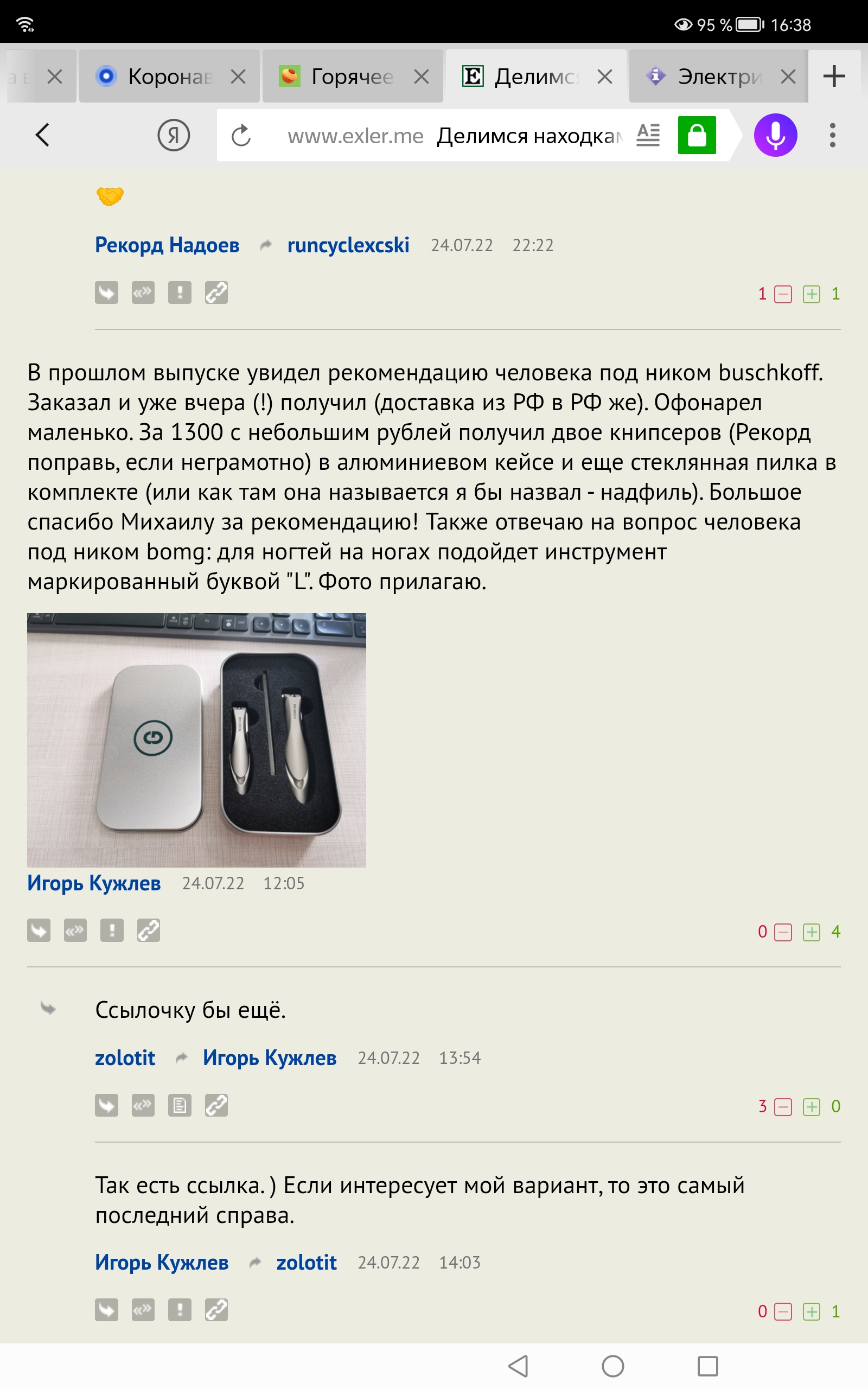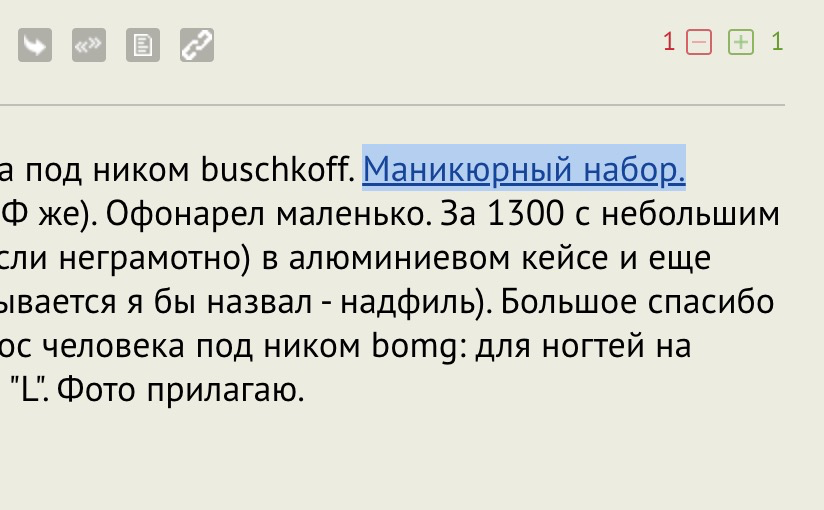 Заказал и уже вчера (!) получил (доставка из РФ в РФ же). Офонарел маленько. За 1300 с небольшим рублей получил двое книпсеров (Рекорд поправь, если неграмотно) в алюминиевом кейсе и еще стеклянная пилка в комплекте (или как там она называется я бы назвал - надфиль). Большое спасибо Михаилу за рекомендацию! Также отвечаю на вопрос человека под ником bomg: для ногтей на ногах подойдет инструмент маркированный буквой "L". Фото прилагаю.