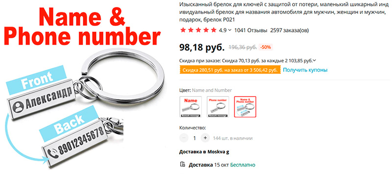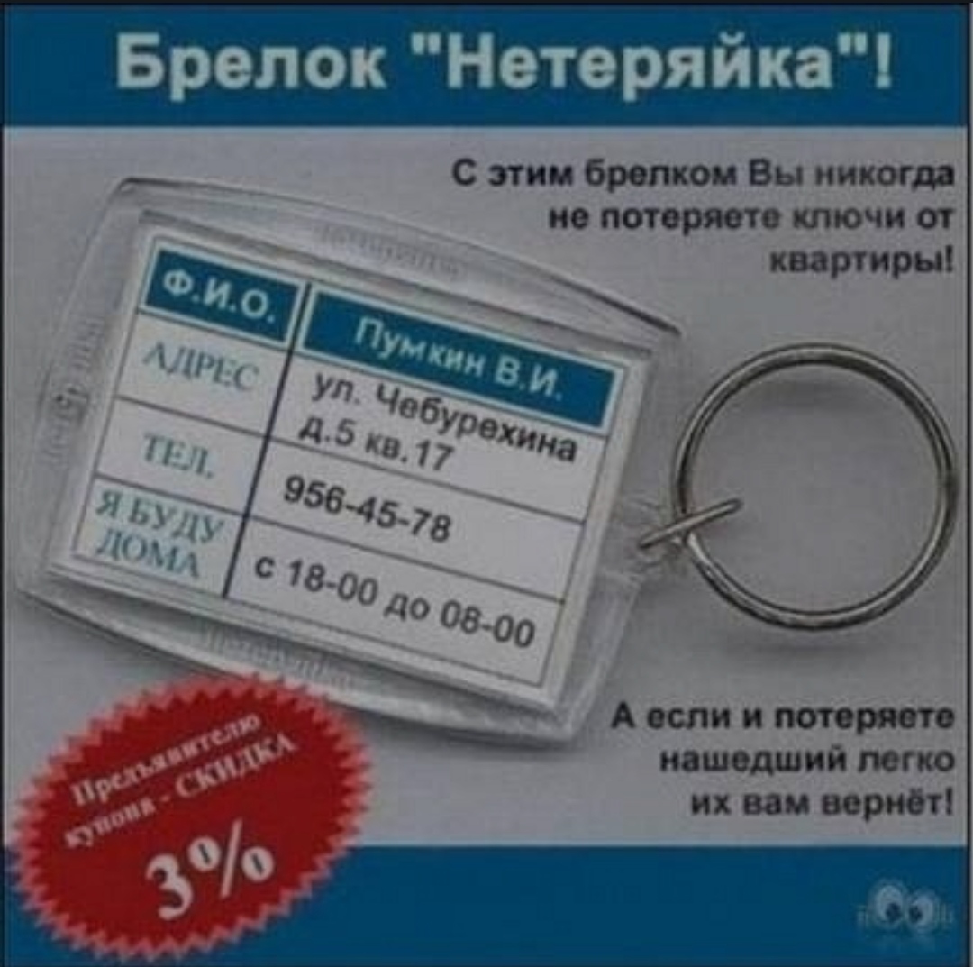 Именной брелок с вашим именем и номером телефонаАга, там еще точного адреса не хватает.
