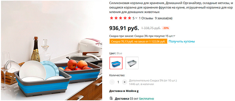 Складывающаяся силиконовая емкость которую можно использовать для хранения чего угодно: посуды после мытья, овощей, фруктов и так далее. Высота регулируется, в сложенном виде места почти не занимает.