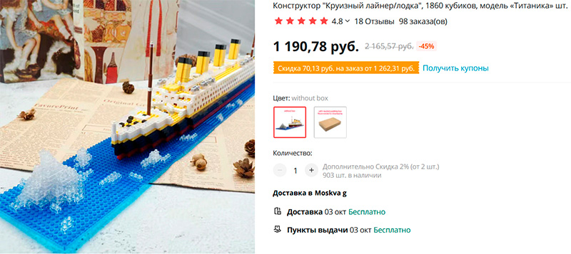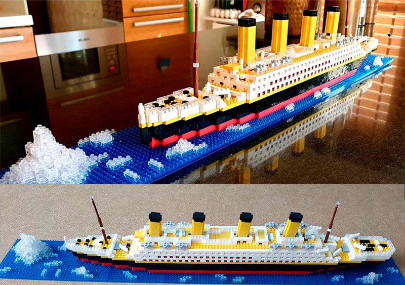 Для любителей навороченных конструкторов - круизный лайнер "Титаник", состоящий из 1860 кубиков. В длину модель будет занимать 56 сантиметров. Также в комплект входят кубики для создания айсберга.