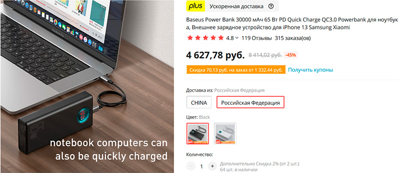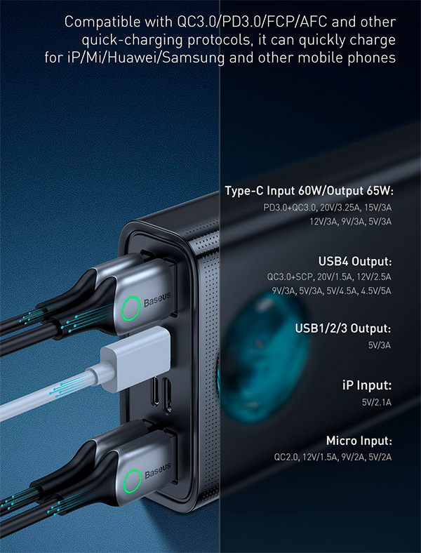 Аккумулятор Baseus ёмкостью 30000 мАч и выходной мощностью 65 ватт - этого хватит для питания ноутбука. Может питать несколько гаджетов одновременно: у него также есть четыре порта USB, из которых один поддерживает зарядку на 30 ватт, три других - на 15 ватт. Сам аккумулятор заряжается через порт Type-C на мощности до 60 ватт. Также есть входные порты  microUSB на 18 ватт и Lightning на 10 ватт. Есть защита от замыкания, перегрева или перегруза.