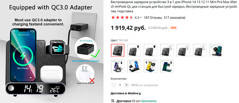 Беспроводные зарядки "3 в 1" для смартфона, наушников и умных часов, поддерживающих стандарт Qi. Мощность зарядки - 15 ватт. Есть вариант со встроенными часами и датчиком температуры.