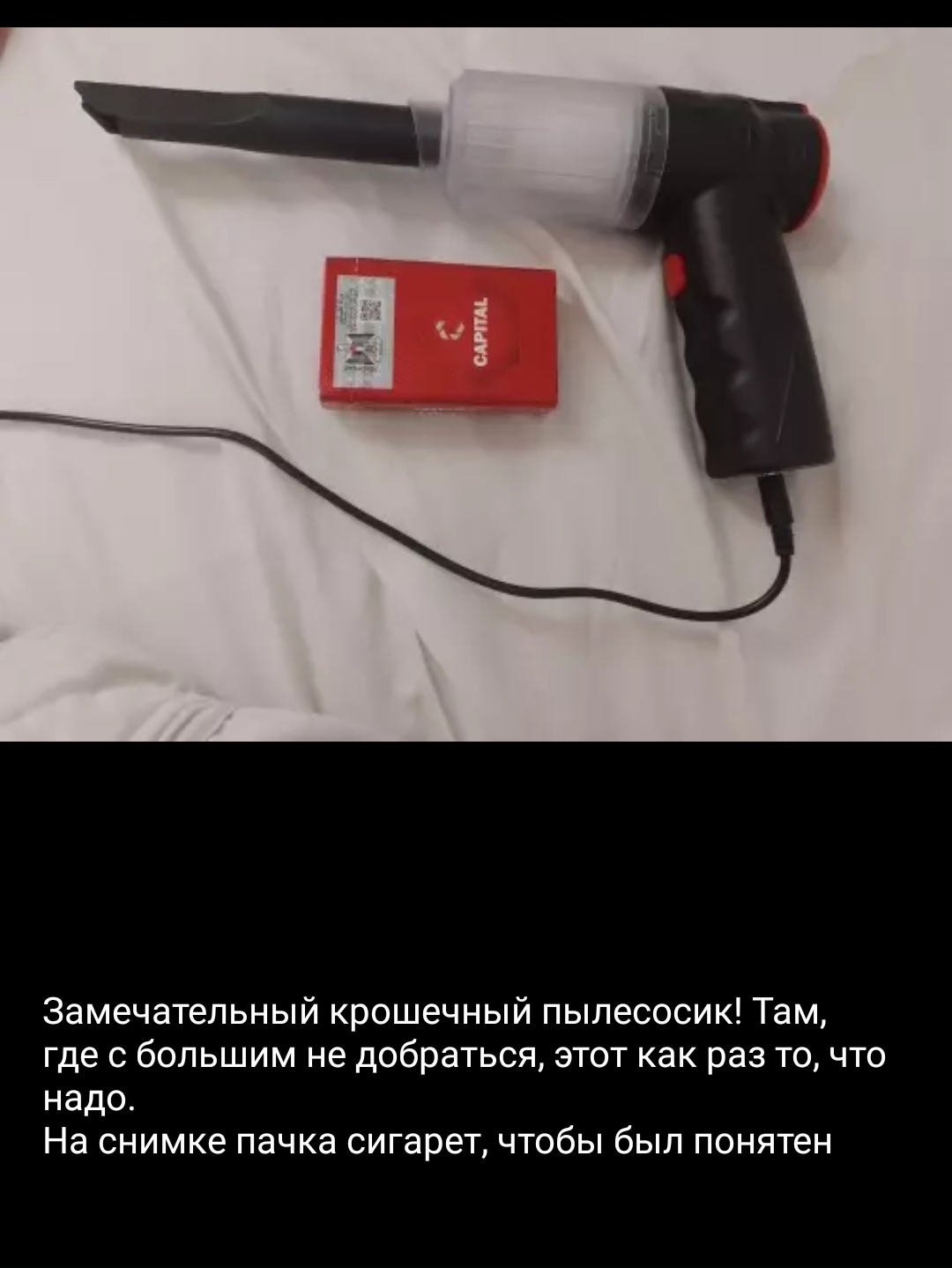 Беспроводной мини-пылесос с мощностью всасывания, как там утверждается, аж 16 тысяч Па. Три режима всасывания, есть подсветка.