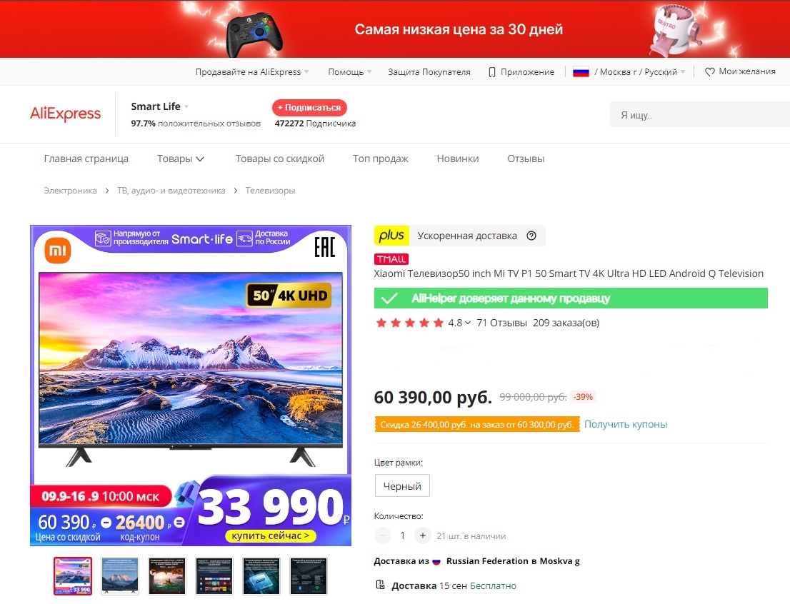 Телевизор на Андроид с диагональю 50 дюймов 4К за 33 990 рублей.