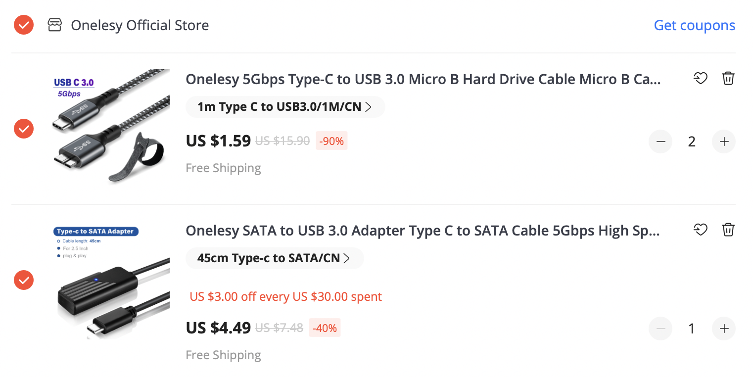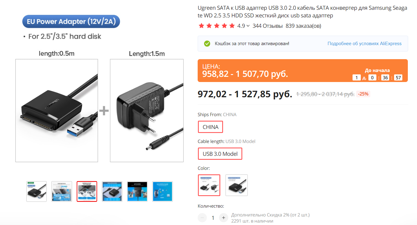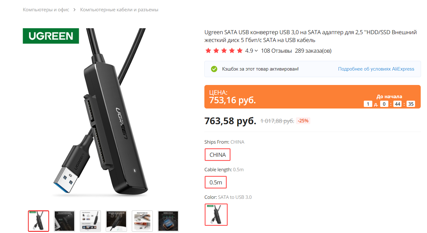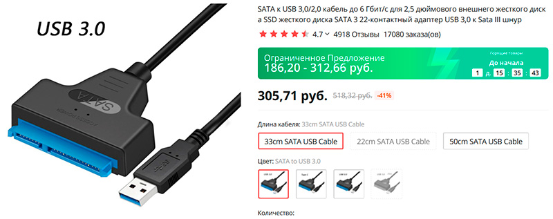 Кабель для подключения 2,5-дюймовых дисков к компьютеру через порт USB 3.0. (Также есть вариант подключения через Type-C.) Удобная штука для ситуаций, когда нужно подключить SATA-диск к компьютеру и не хочется городить огород с док-станциями. (Там пишется, что для 3,5-дюймовых этот кабель не подойдет, питания не хватит.)