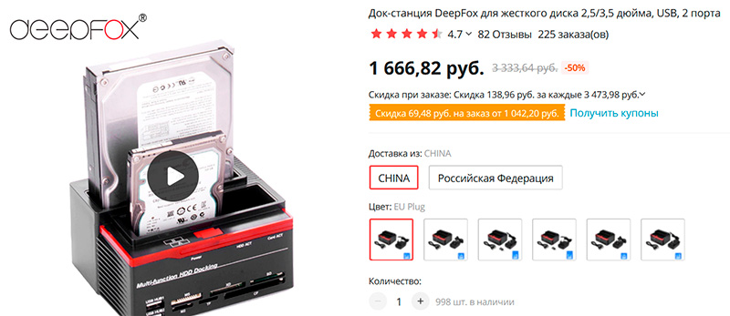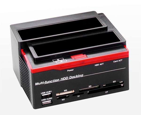 Ну а если все-таки хочется док-станцию и уже для дисков обоих размеров, то вот продвинутая док-станция на два диска 2,5 или 3,5 дюйма, при этом там же еще два порта USB 2.0 (то есть это и USB-хаб) плюс считыватель карт MS/M2/XD/CF/SD/TF. И есть доставка с российского склада.