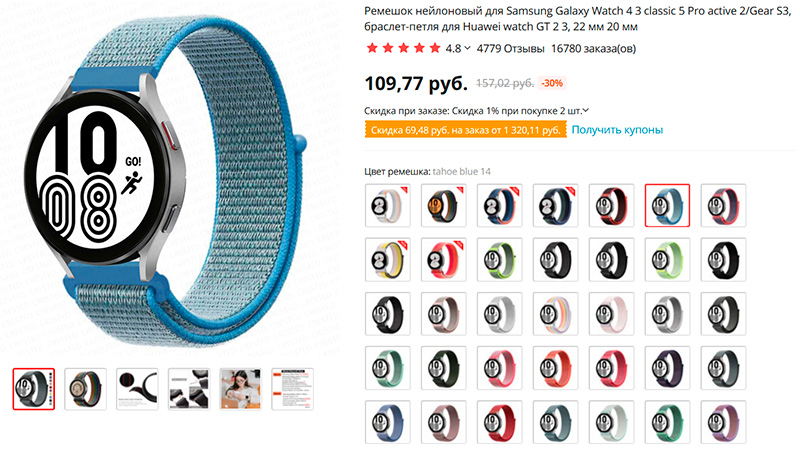 Нейлоновые ремешки самых разнообразных расцветок на 20 и 22 мм для различных моделей Samsung Galaxy Watch и Huawei Watch GT. У меня есть пара таких, хорошая штука. И крепятся удобно - на липучке.
