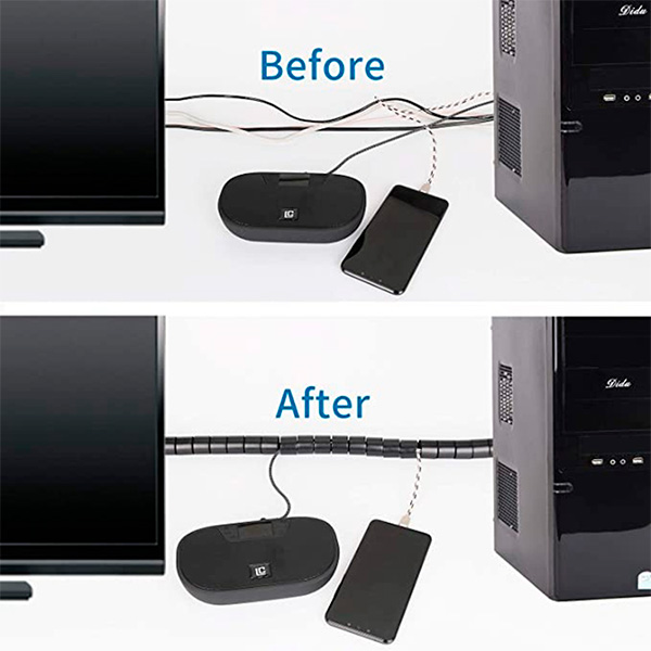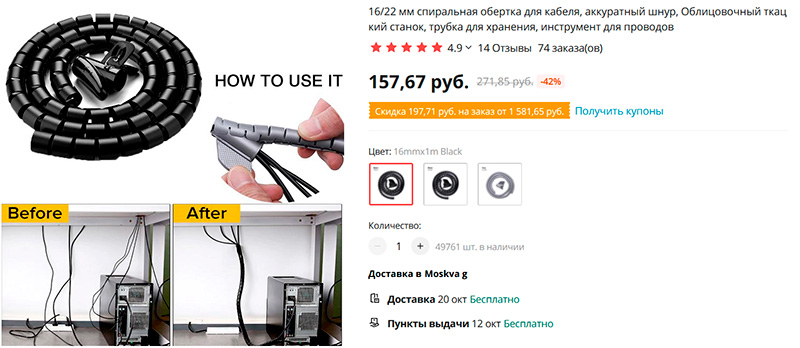 Приводим кабели в порядок - спиральная стяжка для проводов. Метровая, с насадкой-разветвителем, черного и серого цвета, 16 мм и 22 мм толщиной. Этот вариант удобен тем, что кабель может выходить из любого места стяжки. Заказал себе, есть где использовать.