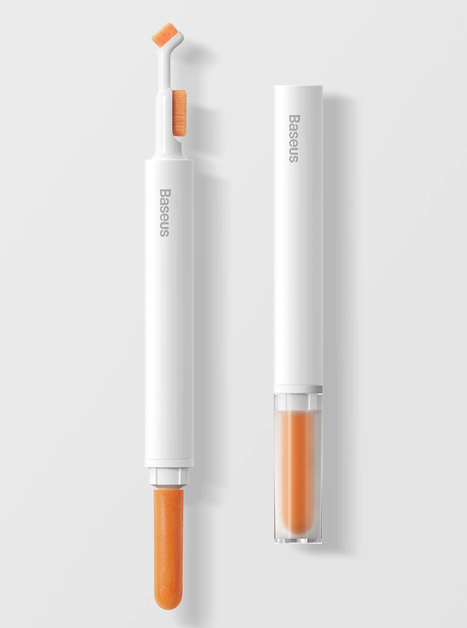 Щёткой можно чистить наушники, клавиатуру, телефон. Она имеет две щётки и губку на другой стороне. Ими можно вычистить все крошки и грязь с аксессуаров. За счёт маленьких размеров можно брать с собой или хранить в стакане с ручками.