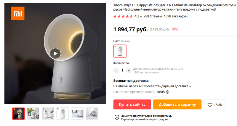 Небольшой безлопастной вентилятор от Xiaomi с увлажнителем. Работает на небольшом расстоянии. Слегка шумит, как пишут в отзывах.