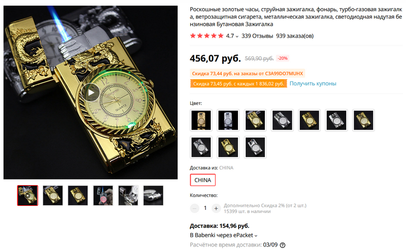 Эффектная турбо-газовая зажигалка с часами. Представлено несколько вариантов: золотые, платиновые, титановые - какие хотите. С разным рисунком. Есть вариант с двумя брюликами. При включении эффектно светится. Может быть хорошим подарком, особенно для людей, которые поверят, что зажигалка золотая или серебряная. Стоит 456 рублей, а там одни часы должны тянуть на 457 рублей, как я считаю. Но 155 рублей придется заплатить за доставку.