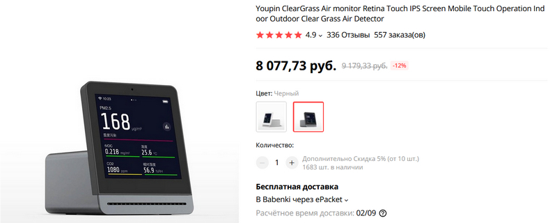Что показывает? Время, погоду, температуру, влажность, индекс PM 2.5 (загрязненность воздуха частицами), уровень углекислого газа и концентрацию летучих органических соединений. Экран сенсорный, есть несколько вариантов виджетов дисплея, показывает графики изменения параметров содержимого воздуха.