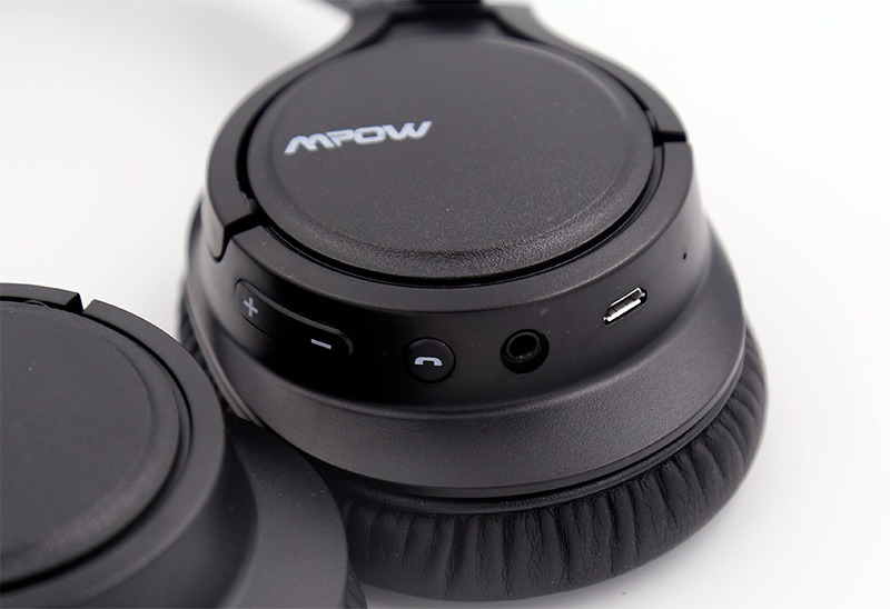 На правой чаше: порт microUSB, аудиовход, три управляющих клавиши: пауза/воспроизведение, она же ответ на звонок и сброс звонка, две кнопки переключения треков, при длинном нажатии - регулировка уровня звука.